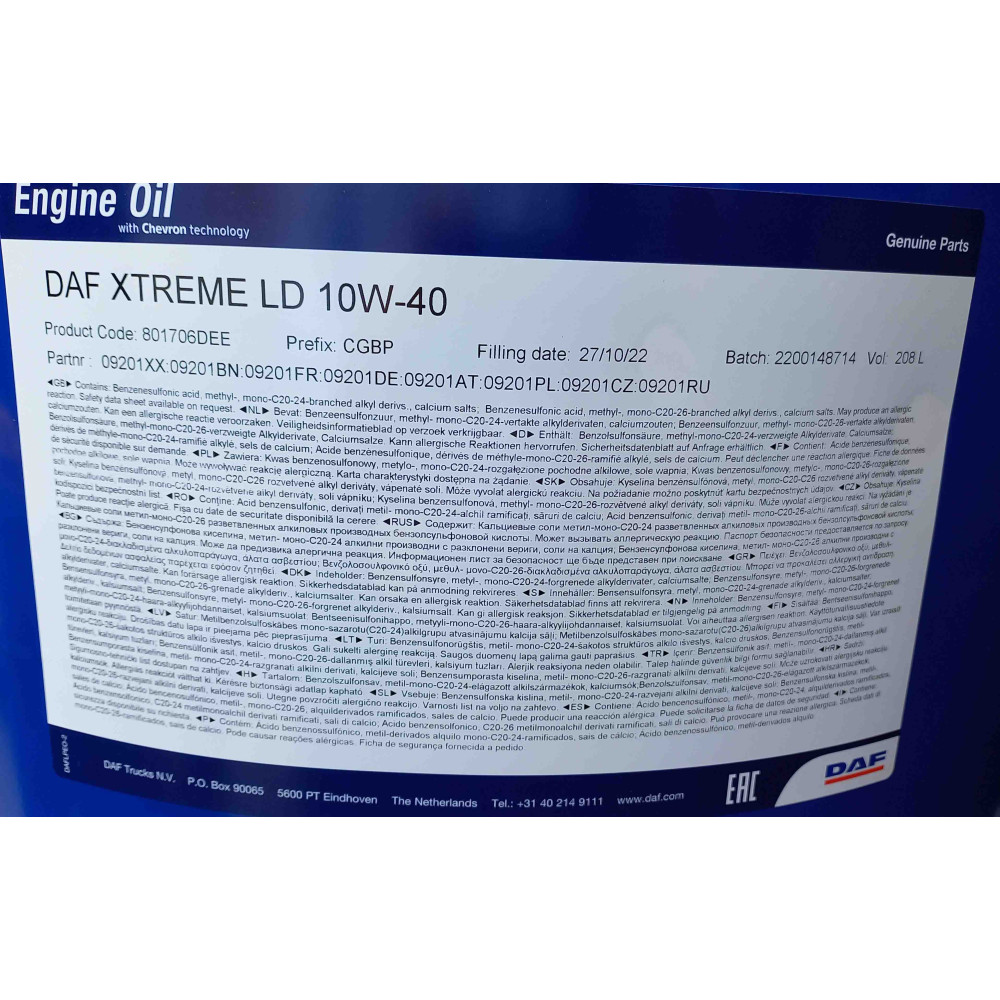 Масло моторное DAF EURO 5 10W40 ; ACEA E6; DEUTZ DQC III-10 LA; MACK EO-N; MAN 3271-1; MAN 3477; MB 226.9; MB 228.51; MTU CATEGORY/TYPE 3.